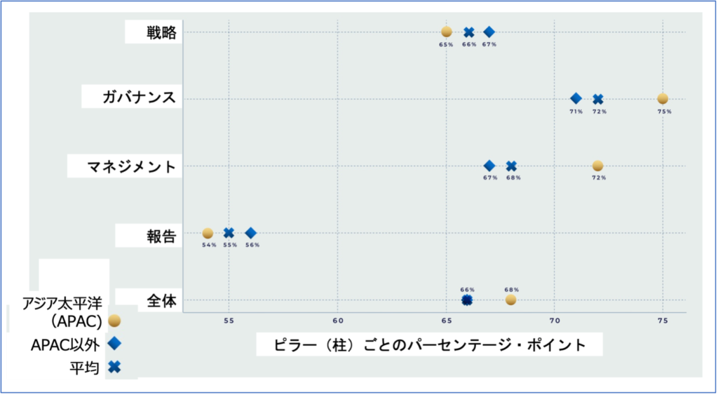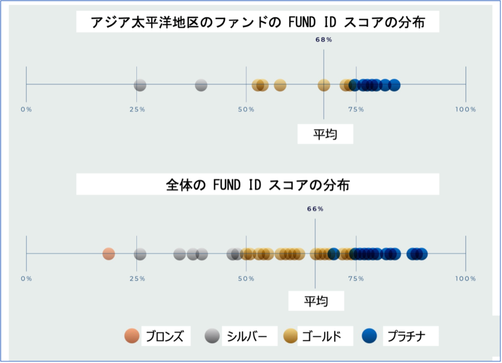 また、Fund ID の4つの柱(ピラー)ごとに見ると、APAC地域のファンドは「ガバナンス」と「マネジメント」分野で平均を上回るパフォーマンスを示す一方、「戦略」と「報告」分野では平均をわずかに下回る結果となりました。